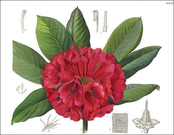 Arbustes ou petits arbres, 2 à 10 m. Feuilles elliptiques à largement obovales, dessous devenant glabre ou avec un indumentum fin composé de poils étoilés et quelquefois aussi avec quelques glandes pétiolées , qui persistent particulièrement près de la nervure centrale. Inflorescence lâche, 5 à 15 fleurs. Calice généralement petit (bien qu'atteignant 17 mm et cupulaire chez le R. schistocalyx). Corolle à 5 lobes, charnue, rouge foncé, tubulaire à campanulée infundibuliforme, avec des nectaires . Etamines 10. Ovaire densément tomenteux , généralement avec des glandes pétiolées en plus ; style glabre.