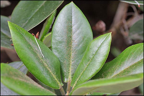 Shrubs or small trees. Leaves ovate to broadly elliptic, lower surface covered with a dendroid indumentum, to (rarely) more or less glabrous. Inflorescence lax or dense, 5-15-flowered. Calyx small. Corolla 5-lobed, whitish to pale mauve, open- to funnel-campanulate, nectar pouches absent. Stamen 10. Ovary ans style glabrous.