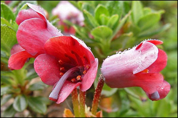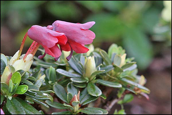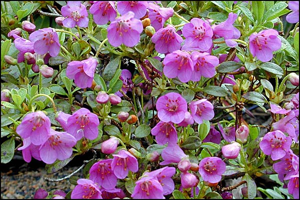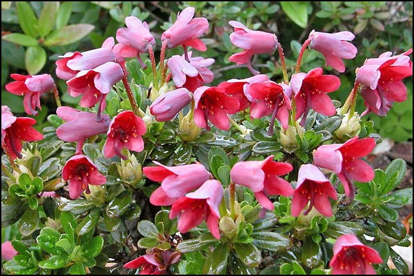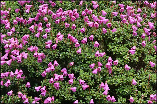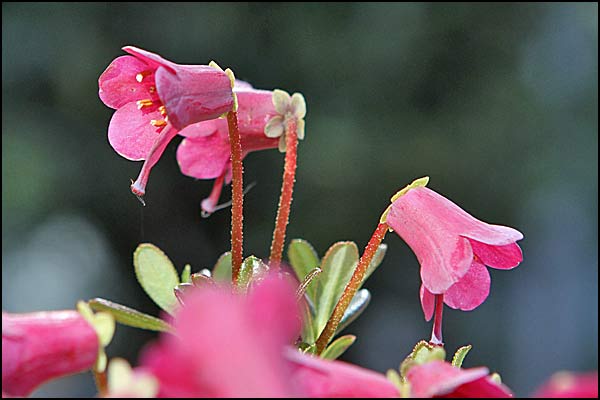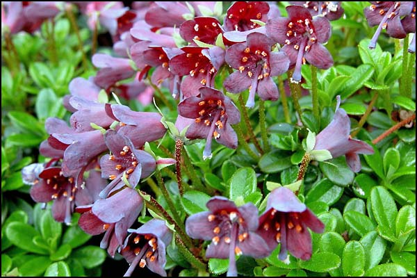 Dwarf, usually prostrate shrubs ; young growth scaly, glabrous or pubescent. Leaves evergreen, lower surface papillose , often whitish, scales for the most part deciduous, distant, vesicular . Inflorescence terminal, 1-3-flowered. Corolla campanulate ; stamens 10, regularly arranged ; ovary impressed below the sharply deflexed style. Seeds lacking wings and only obscurely finned.