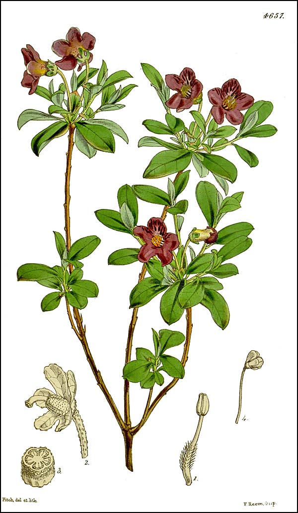 Small schrub, to 2m ; young shoots scaly , setose and pubescent to glabrous. Leaves evergreen or deciduous, scales on lower surface distant or touching, with broad translucent rims. Inflorescence terminal, 1-5-flowered. Calyx well-developed . Corolla campanulate ; stamens 10, regularly arranged, ovary impressed below the very short, sharply deflexed style. Seeds unwinged and obscurely finned.