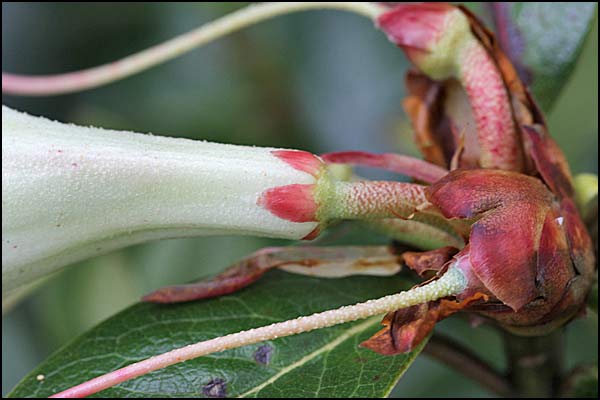Shrubs, sometimes epiphytic, or small trees, to 12m ; young shoots scaly, often also setose. Leaves evergreen, lower surface whitish- or greyish-papillose, scales distant or dense, sometimes with crenulate margins. Inflorescence 1-7-flowered. Calyx usually conspicuous. Corolla funnel-campanulate ; stamens 8-27 though usually c.10, declinate ; ovary tapering into style or impressed below the declinate style. Seeds winged and finned.