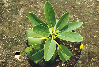 Cette photo montre une bouture prête à être plantée en pleine terre. On peut encore lire son numéro d'identification écrit directement à l'envers de la feuille avec un stylo à encre "permanente". Dès que vous bouturez plusieurs variétés il est en effet nécessaire d'adopter un système d'identification.