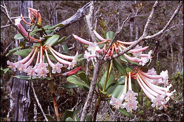 Scales disk-shaped with a relatively large swolen centre and narrow entire to slightly lobed margin or flange, dense to sparse on the undersides of the leaves but rarely touching and never overlapping in the mature state. Corolla trumpet-shaped, the tube narrow and elongate with the lobes less than 1/4 of the total length of the flower, white or white flushed pink.