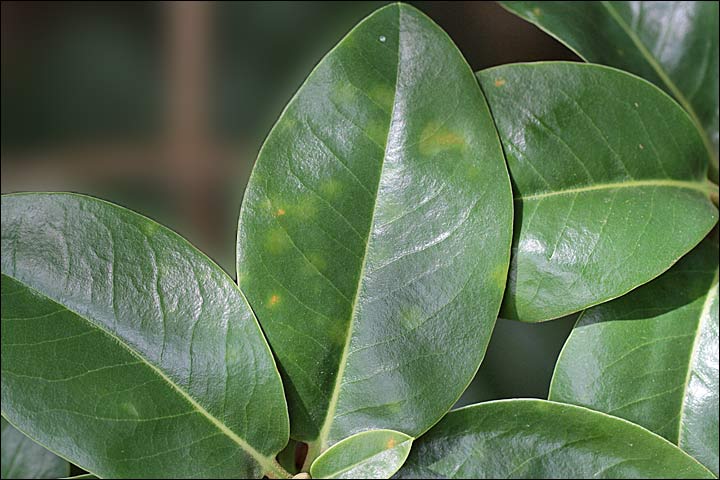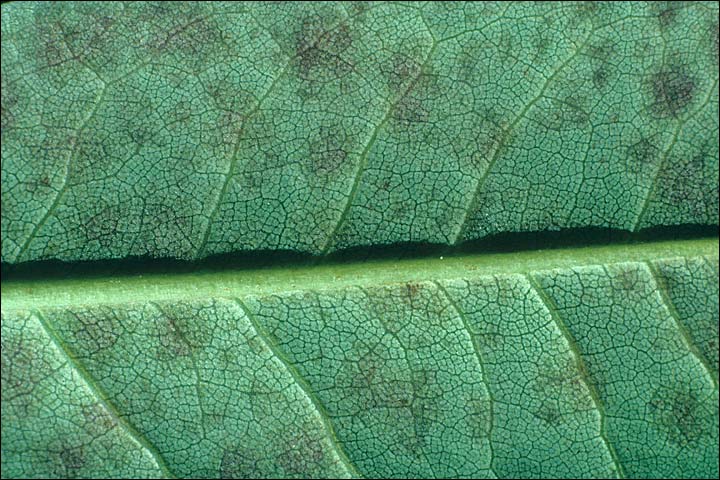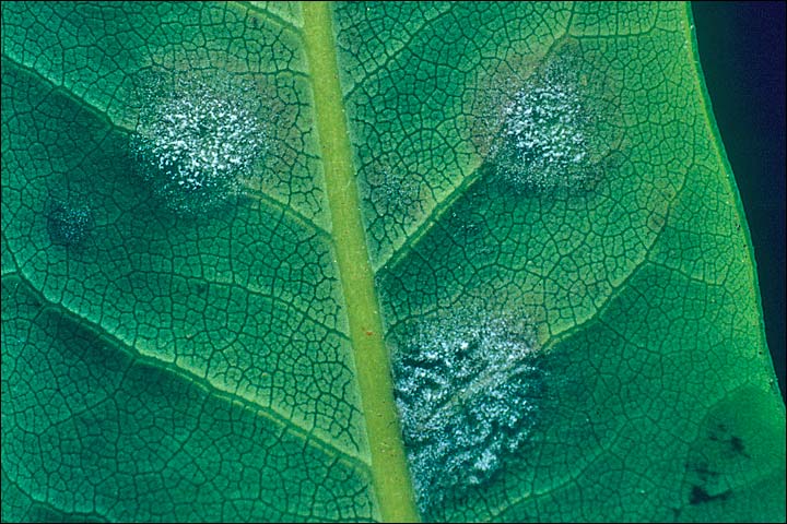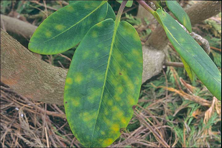 Mais l'oidium sait se faire discret sur de nombreux rhododendrons et les premiers symptômes sont de petites taches décolorées plus ou moins circulaires à la surface supérieure de la feuille avec correspondance à l'envers sans qu'il y ait cette sorte de farine blanche.